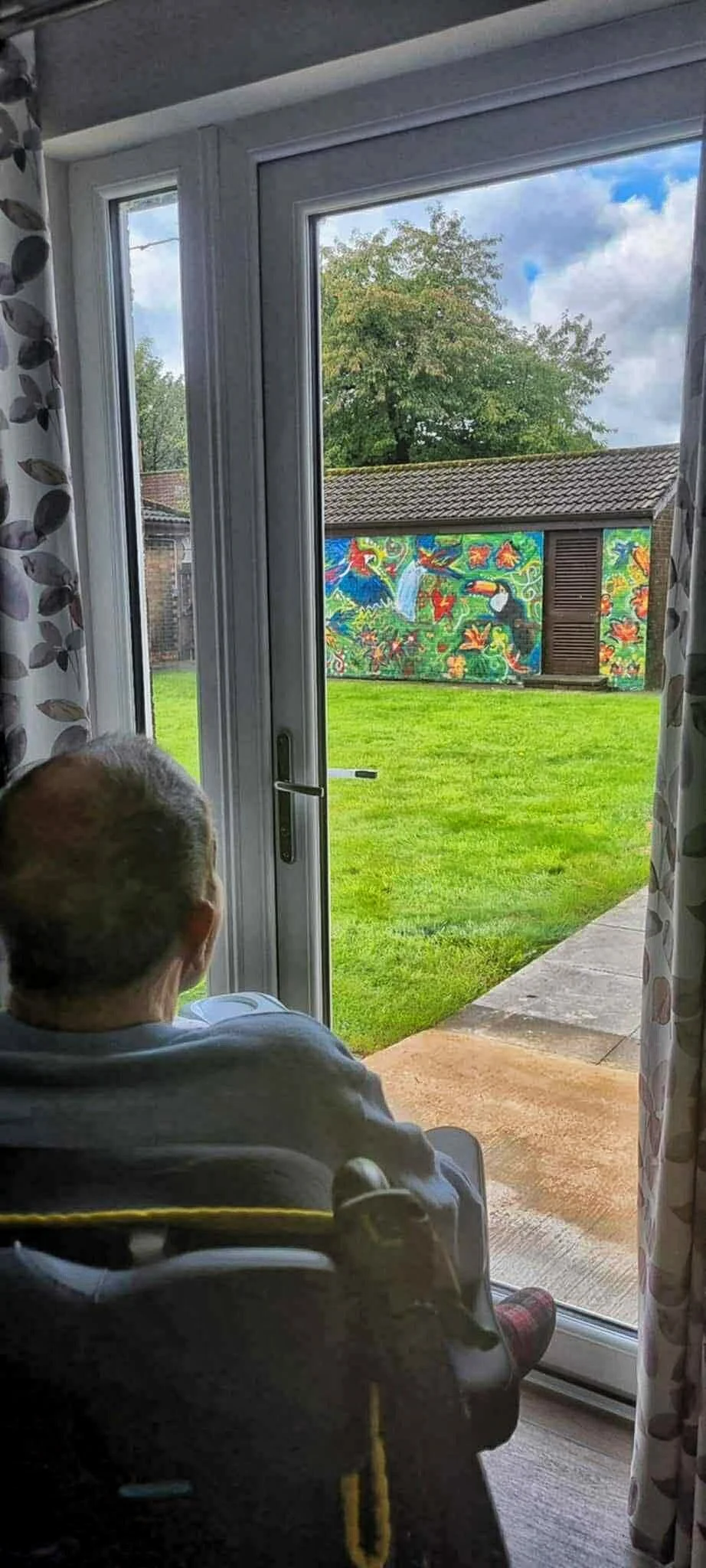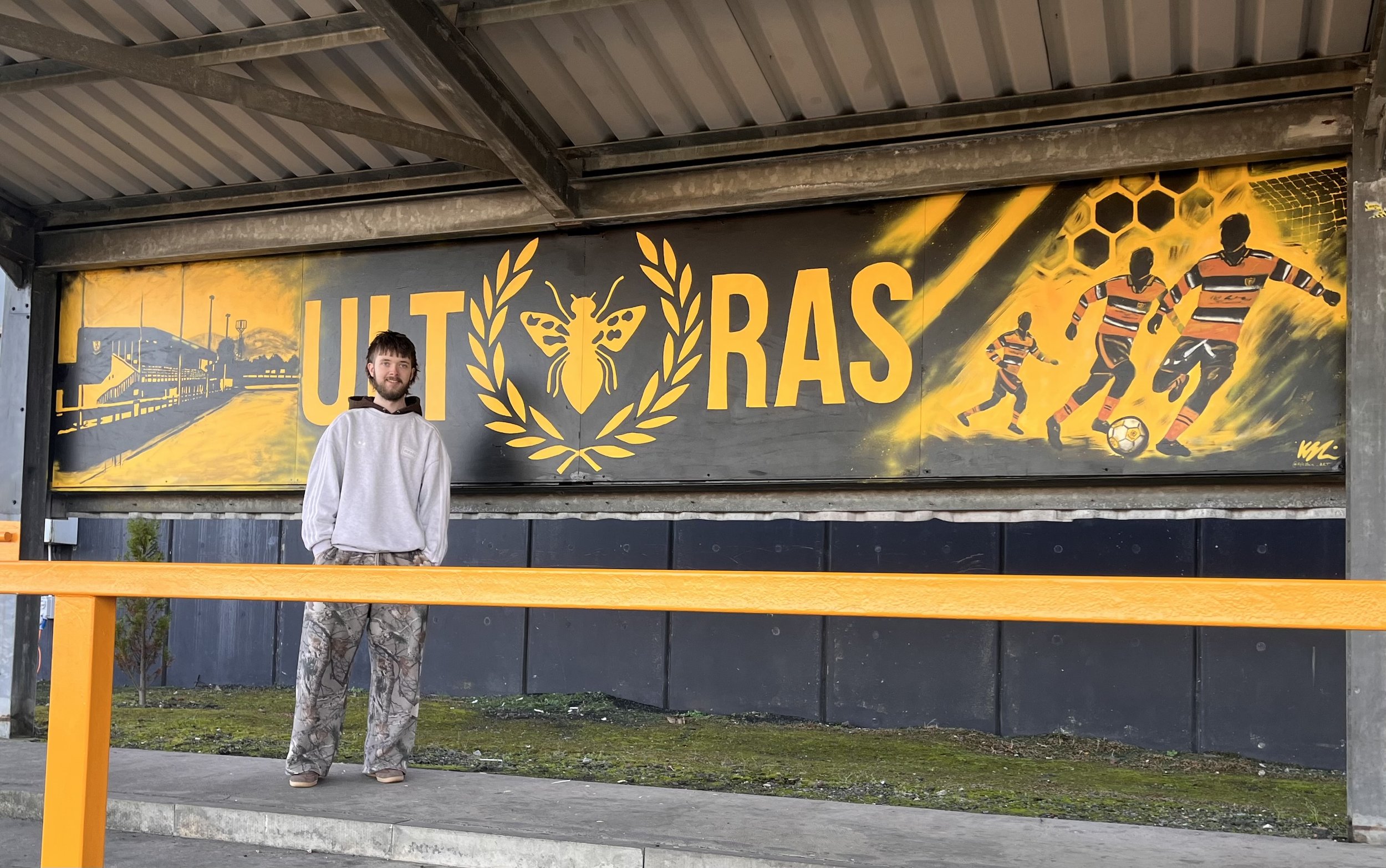 Since that first school exhibition, more opportunities followed. In 2024, I was lucky to receive funding from my local council to work in schools, hosting pop-up workshops and exhibitions and developing legacy projects. These included creating a large-scale mural in a local care home with Advanced Higher art pupils and donating a painting to Forth Valley Hospital in memory of my grandad. I was also grateful to be named a finalist for a Young Scot Award, which led to me being appointed Community Artist for Clackmannanshire's Family Wellbeing Partnership. Through that role, I've created a nineteen-foot mural for Alloa Athletic FC, worked in schools and community spaces like The Hive, and produced work designed to remain visible long after the projects end. All of this feeds into a wider practice centred on community storytelling and shared experience.