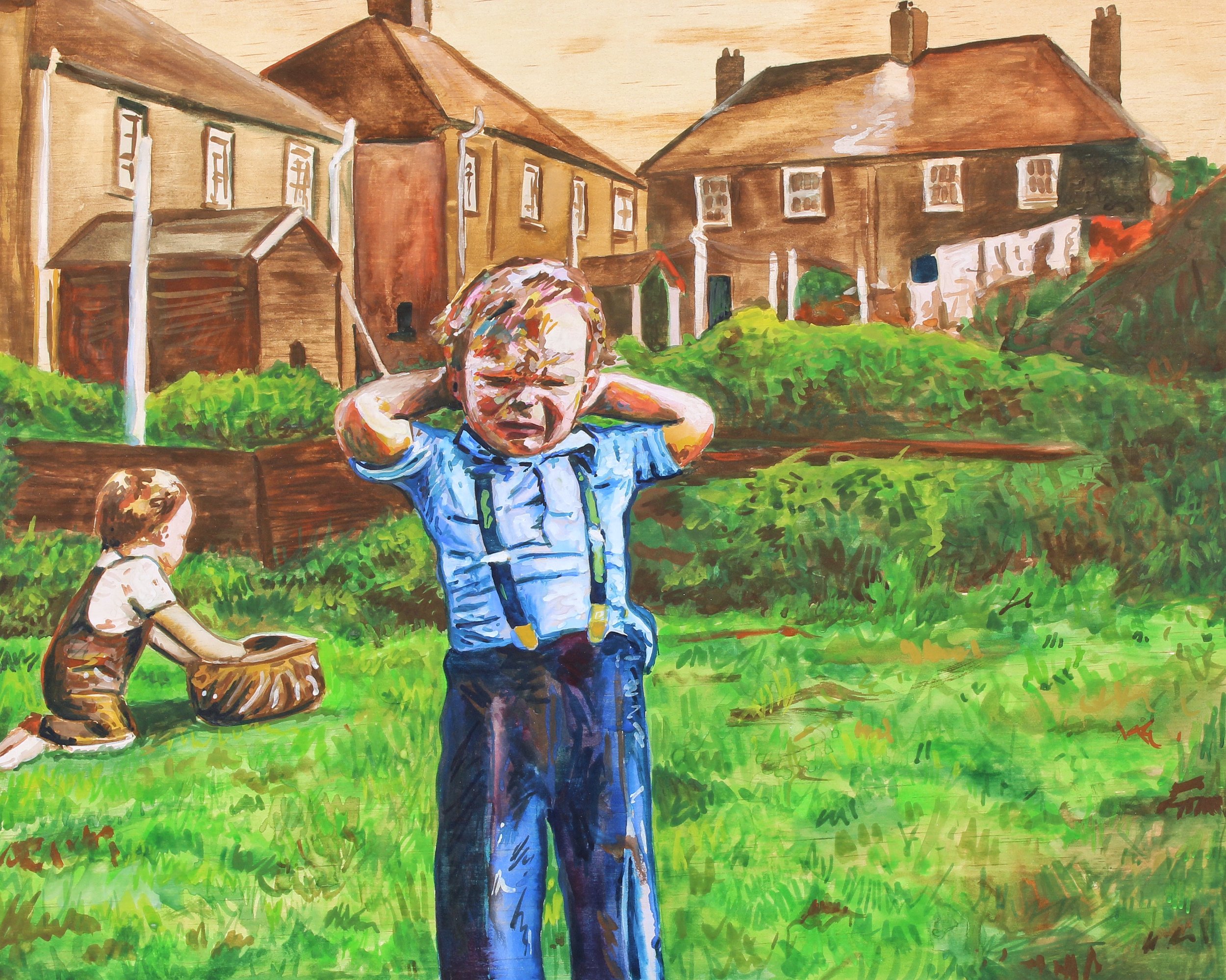 It started as a nostalgia trip. After my grandad passed away, we were looking through old photos at my gran's house trying to find pictures of him. We came across everything from baby photos of my brothers and I, to photos of my dad at my age now, and even ones from before the 1940s. At first, I was drawn to the sense of a time gone by, things like outdated landline phones and tacky wallpaper choices. As I kept painting, the focus deliberately shifted from nostalgia to my own childhood and lived experience. I realised how much people related to these scenes and recognised similar moments in their own family photos. From there it naturally grew into a wider curation of what I knew growing up.