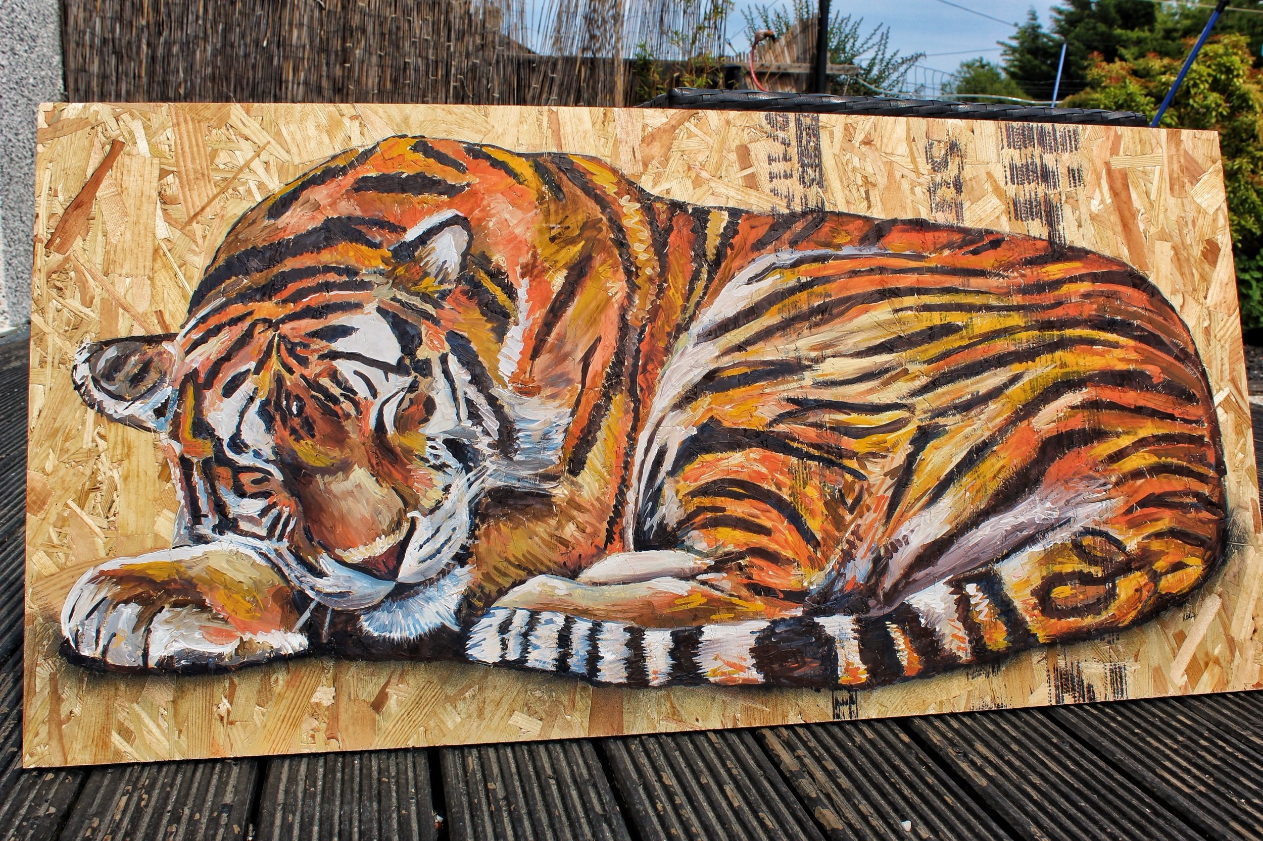 Image 1 of 4 Image 2 of 4 Image 3 of 4 Image 4 of 4 Sleepy Tiger £700.00 Emulsion and Acrylic on OSB Board. 202560x120cm Add To Cart Added! Emulsion and Acrylic on OSB Board. 202560x120cm