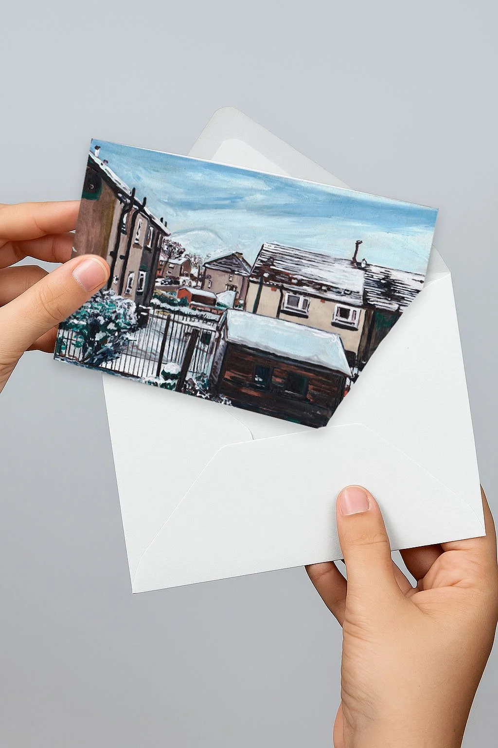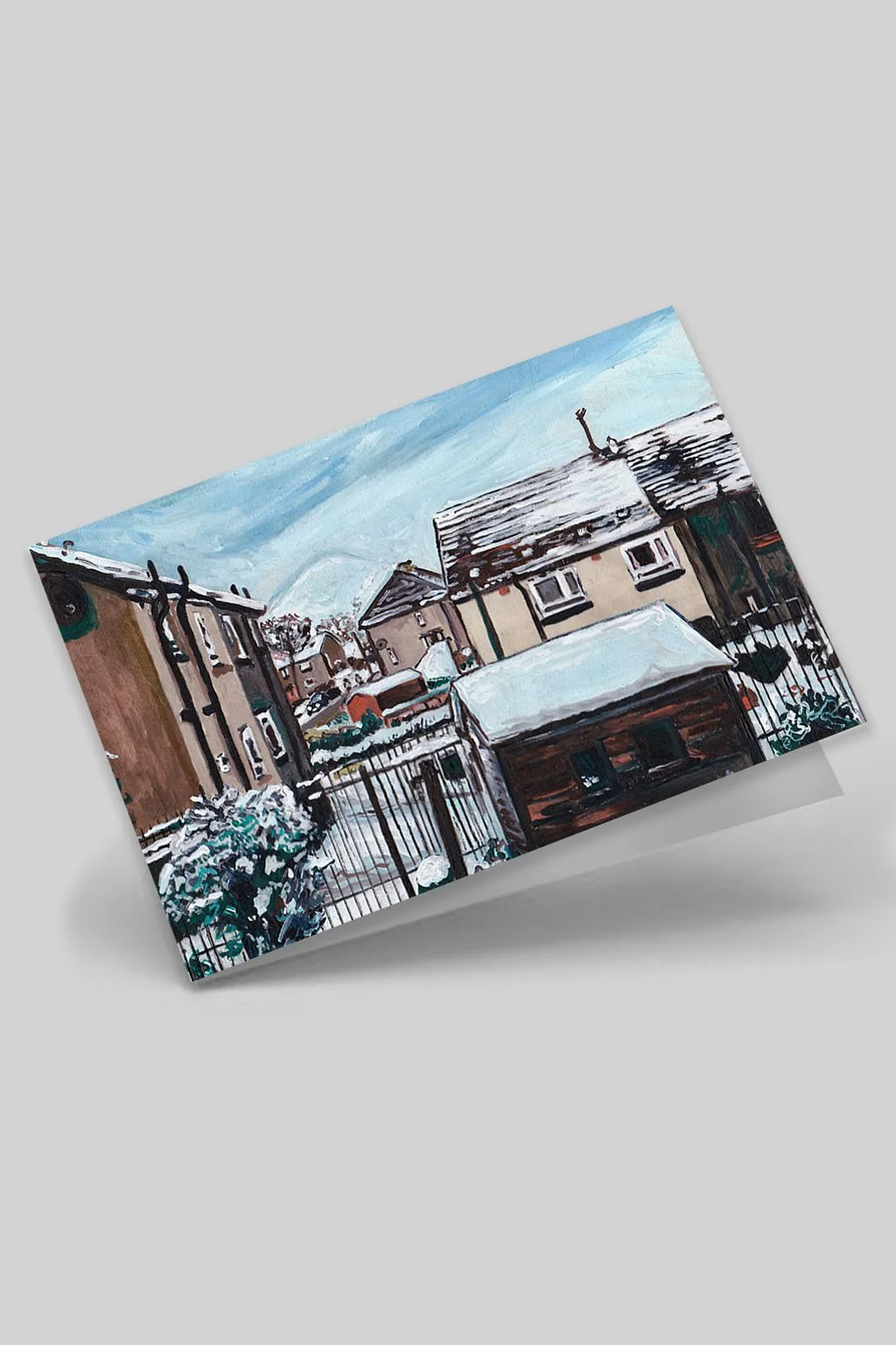 This A5 landscape greeting card features my painting “Snow Day” from my Common People series. The painting is based on a photo taken outside my gran’s back door in the mid-2000s, showing a quiet winter scene of snow-covered rooftops in a typical central Scotland housing scheme. A nostalgic image that captures the warmth of familiar places in colder months - perfect for sending or gifting this holiday season.